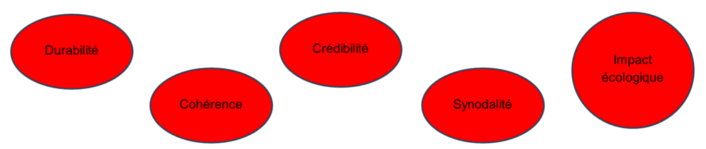 - Les 240 paroisses, les maisons diocésaines, congrégations religieuses et l’évêché intègrent au minimum six critères de durabilité dans la gestion de leurs institutions et infrastructures (H2).